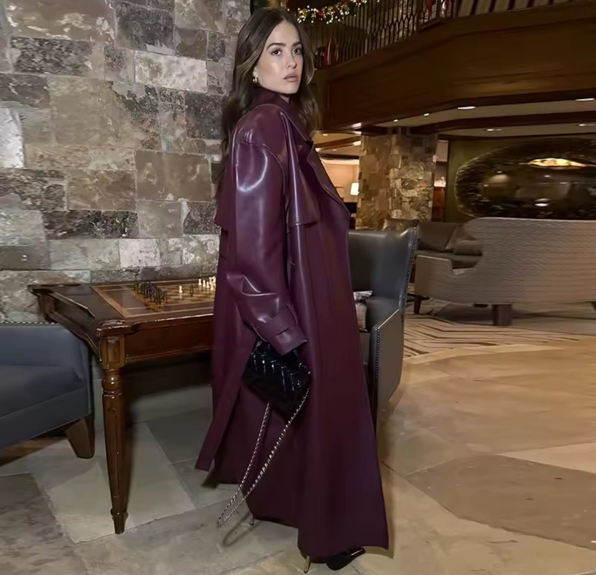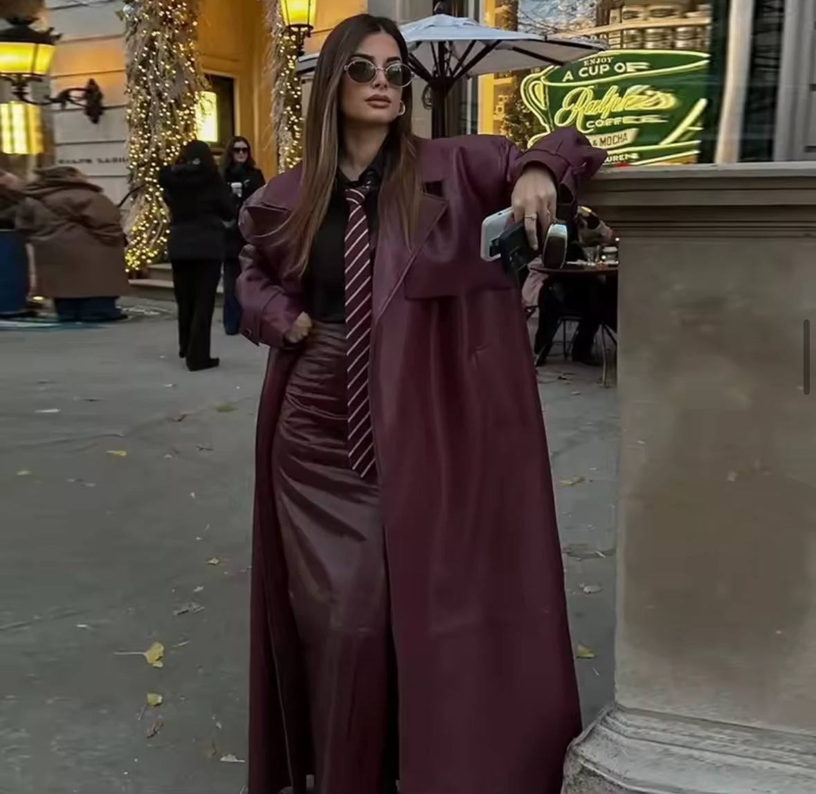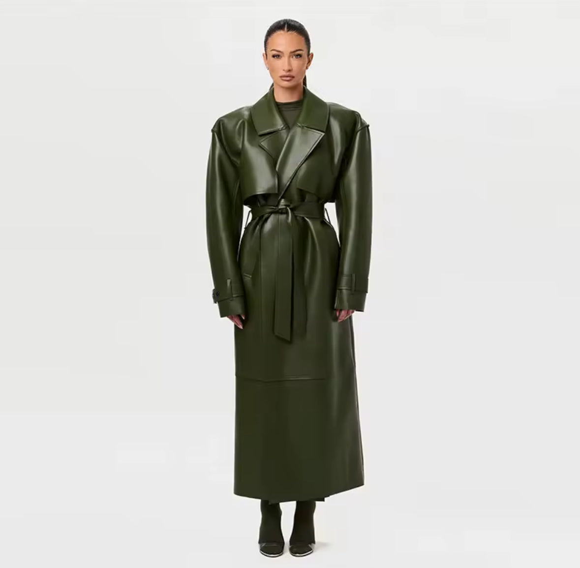 Es tu armadura urbana. Este imponente chaquetón largo tipo cuero, con su corte clásico y detalles robustos, esta diseñado para quienes buscan elegancia con carácter. El cuello de muesca, la correa de hombro y su silueta abotonada crean una estética atemporal que destila confianza ypotencia.