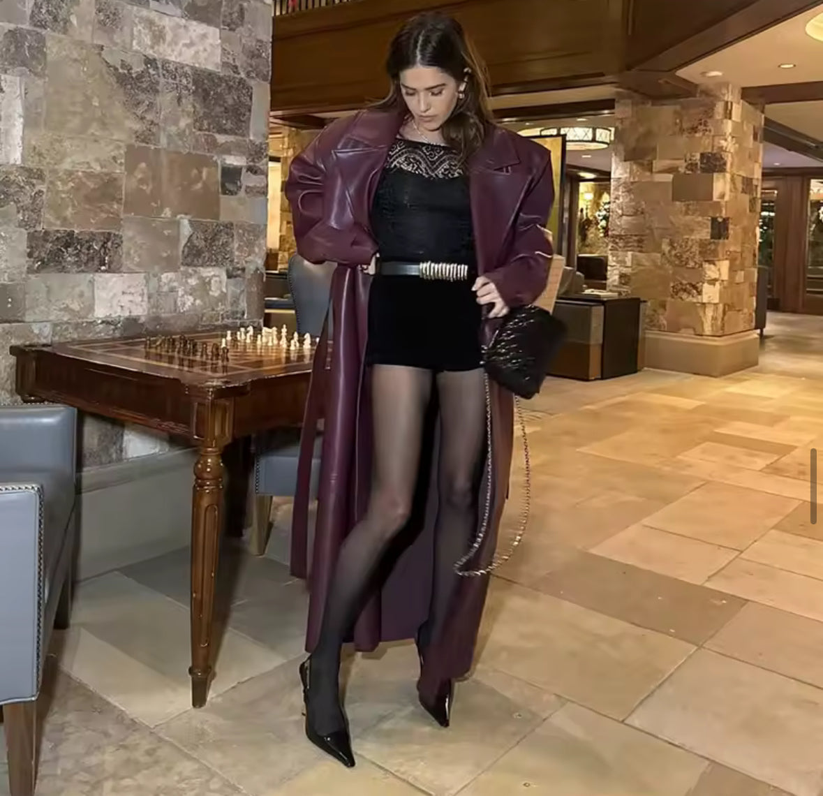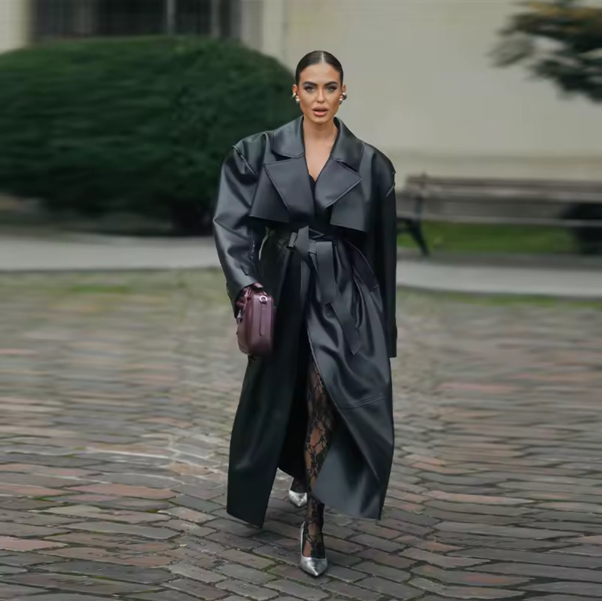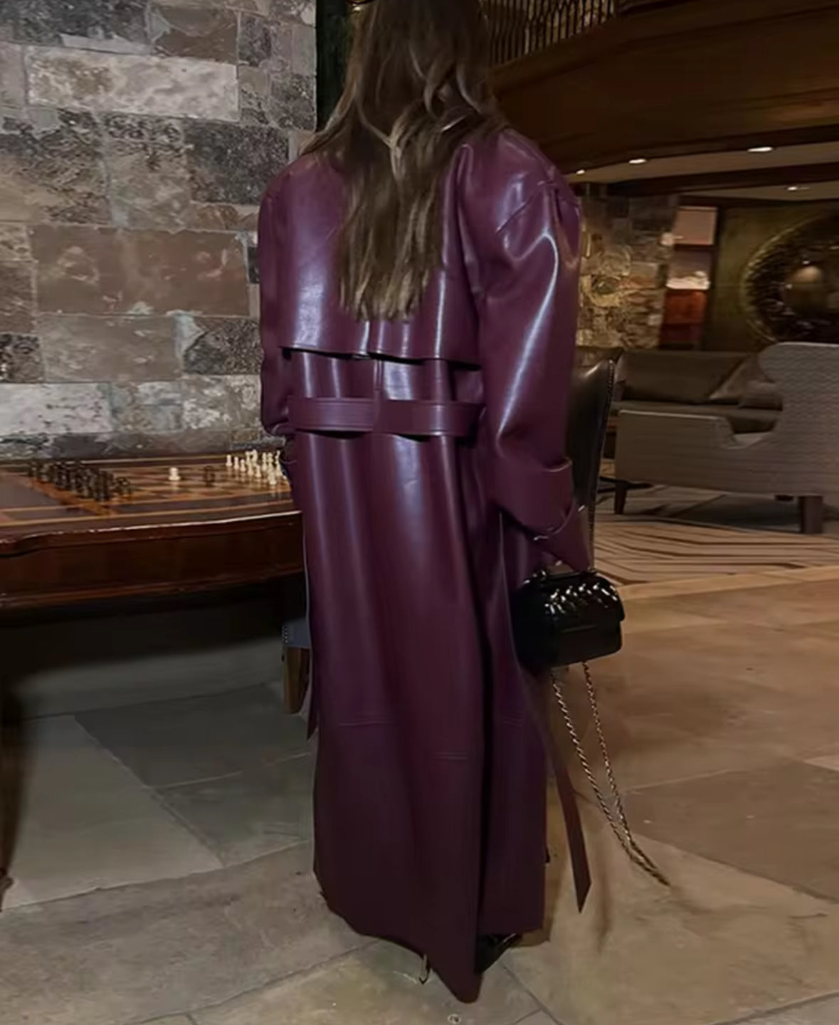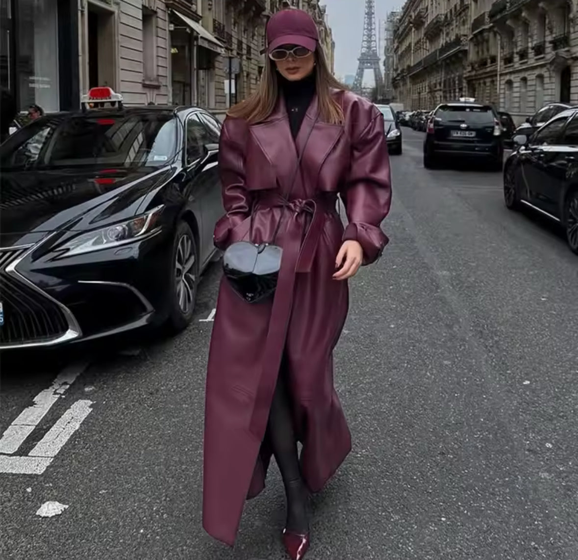 Es tu armadura urbana. Este imponente chaquetón largo tipo cuero, con su corte clásico y detalles robustos, esta diseñado para quienes buscan elegancia con carácter. El cuello de muesca, la correa de hombro y su silueta abotonada crean una estética atemporal que destila confianza ypotencia.